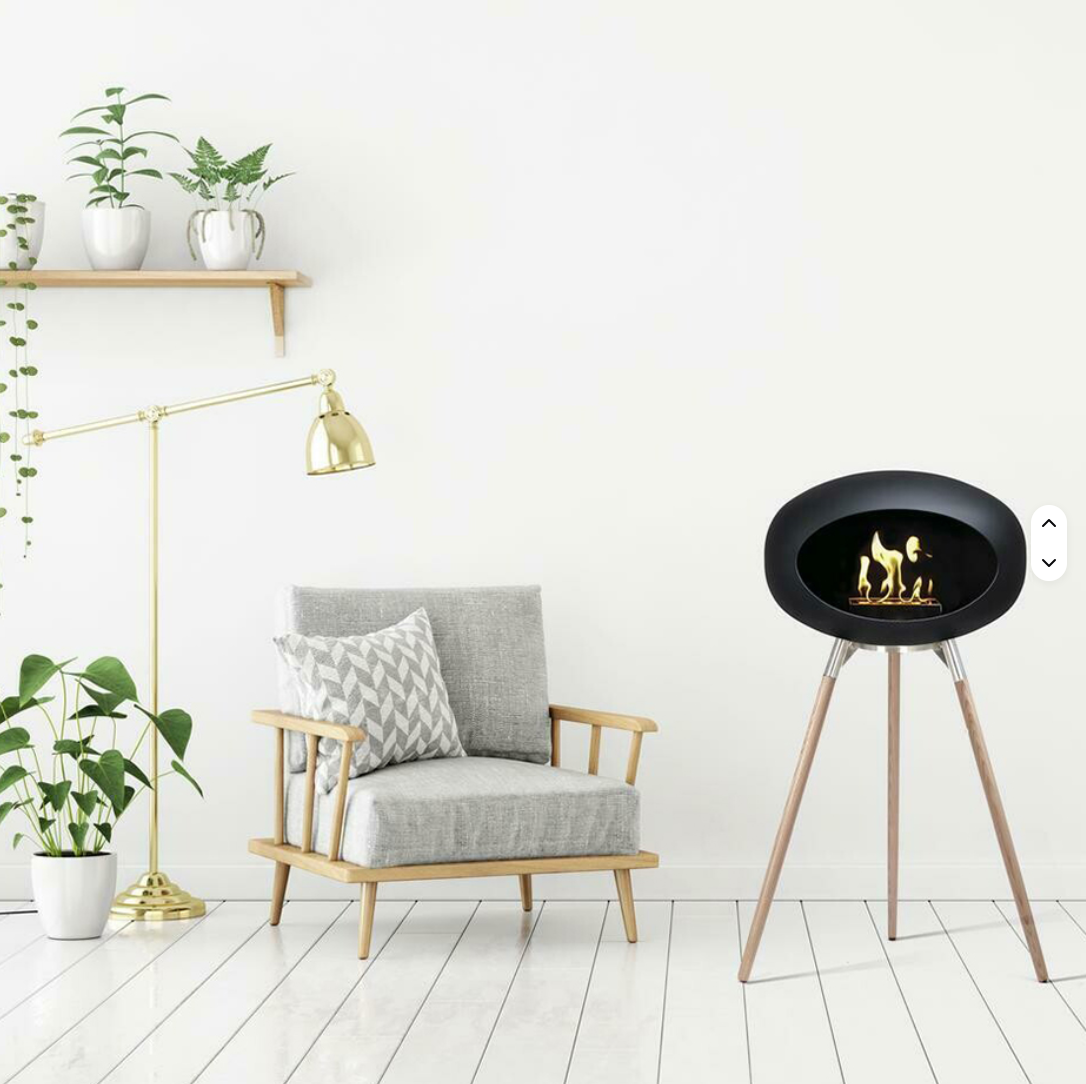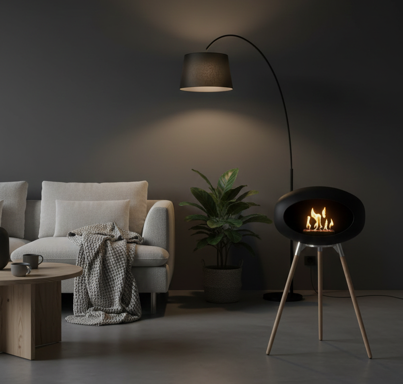 Vælg mellem fritstående og lofthængte modeller i tidløst design – nem installation, ingen røg og ingen skorsten.