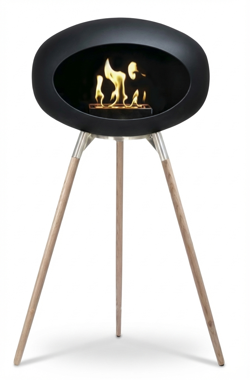 Biopejsen drives af bioethanol og giver en stemningsfuld flamme uden sod, røg eller aske. Det stilrene tripod-design i sort metal og valnød passer perfekt ind i moderne indretning og fungerer både som varmekilde og dekorativt element.